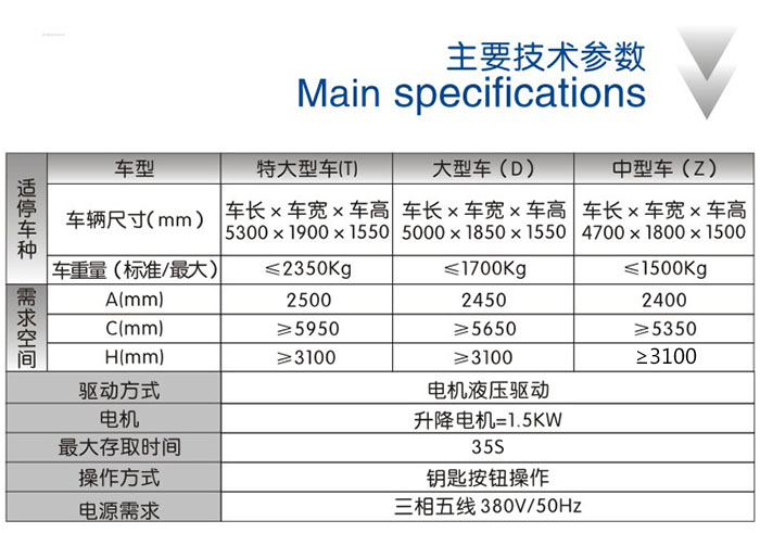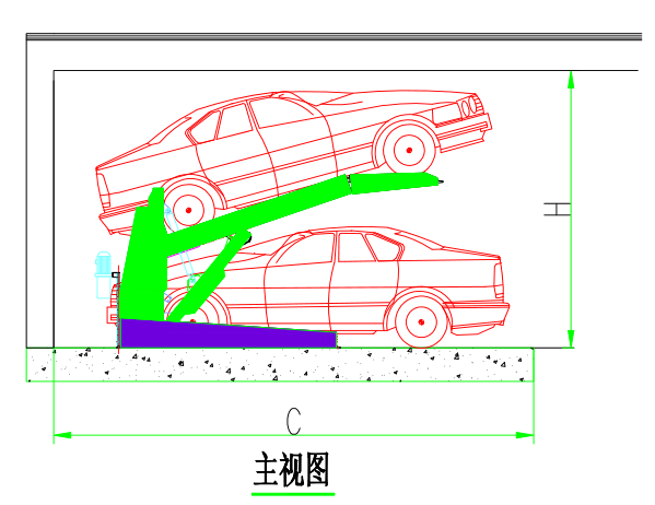 二層簡易升降 運行原理 該設(shè)備充分利用空間,一個車位能停兩輛車。上面層載車板可上下升降;地面層無載車板,地面層車開出后,上方的載車板下降到地面層,完成存取過程。 特點 ●對有限的停車空間,可倍雙停放車輛,